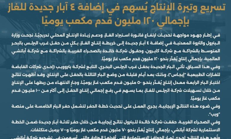 في إطار جهود مواجهة تحديات ارتفاع فاتورة استيراد الغاز، ودعم زيادة الإنتاج المحلي تدريجيًا، نجحت وزارة البترول والثروة المعدنية في إضافة 4 آبار جديدة إلى خريطة إنتاج الغاز، بكلٍ من حقل غرب البرلس بالبحر المتوسط بالشراكة مع شركة كايرون، وحقول شركة خالدة بالصحراء الغربية بالشراكة مع شركة أباتشي العالمية، بإجمالي إنتاج يُقدَّر بنحو 120 مليون قدم مكعب غاز يوميًا.