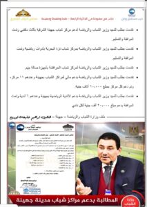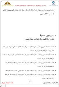 في ملف الشباب والرياضة تم تقديم المساعدة لجميع مراكز الشباب بالقري والنجوع وتقديم ما يلزم لتطويرها والنهوض بها