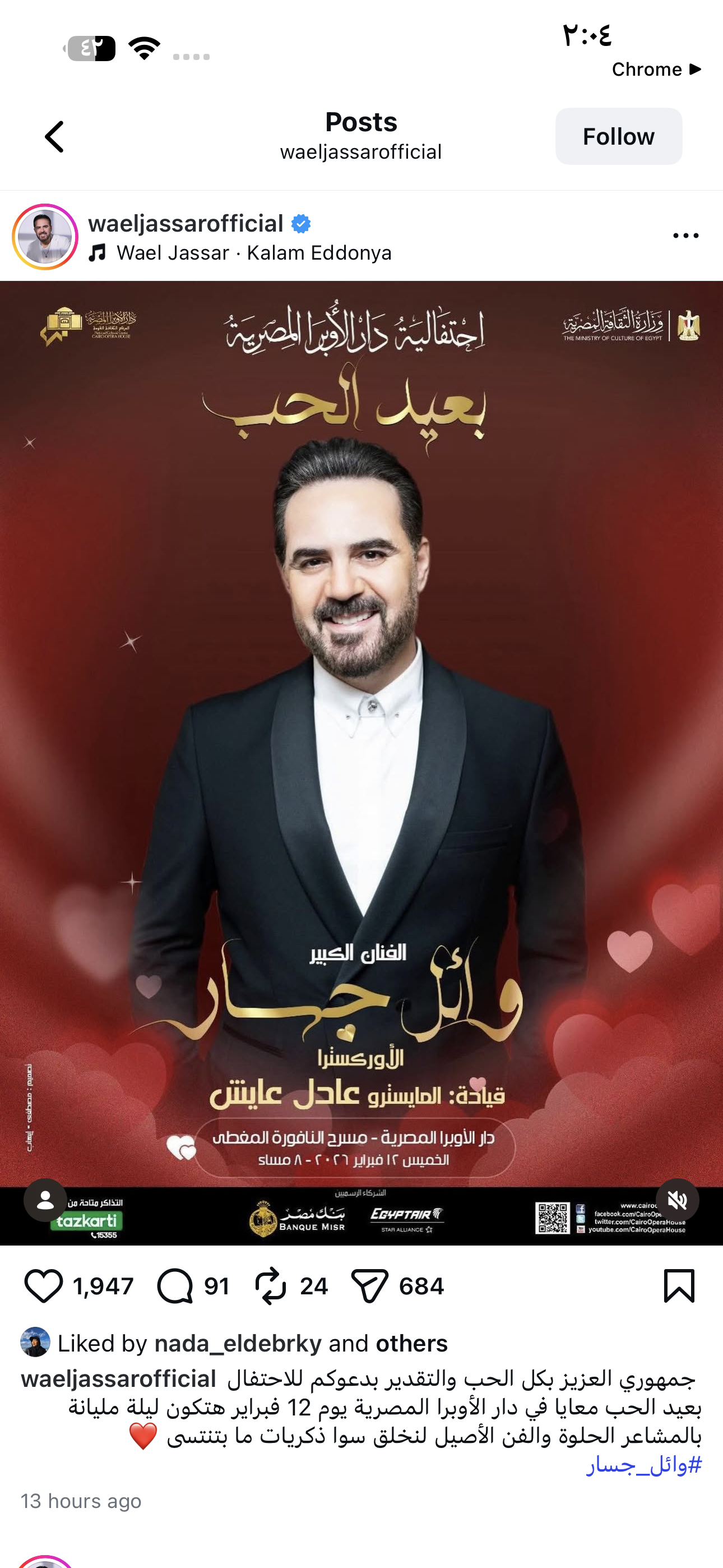 وكتب وائل جسار رسالة لجمهوره عبر حسابه الرسمي على موقع «إنستجرام«جمهورى العزيز بكل الحب والتقدير بدعوكم للاحتفال بعيد الحب معايا فى دار الأوبرا المصرية يوم 12 فبراير هتكون ليلة مليانة بالمشاعر الحلوة والفن الأصيل لنخلق سوا ذكريات ما بتنتسى».
