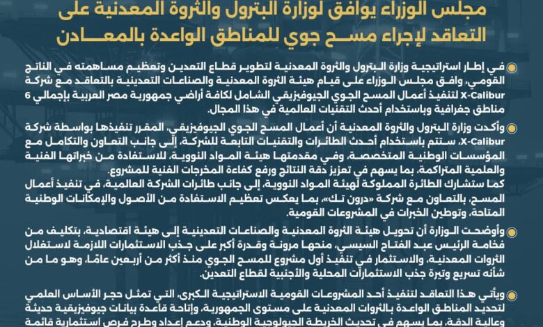 مجلس الوزراء يوافق لوزارة البترول والثروة المعدنية على التعاقد لإجراء مسح جوي للمناطق الواعدة بالمعادن