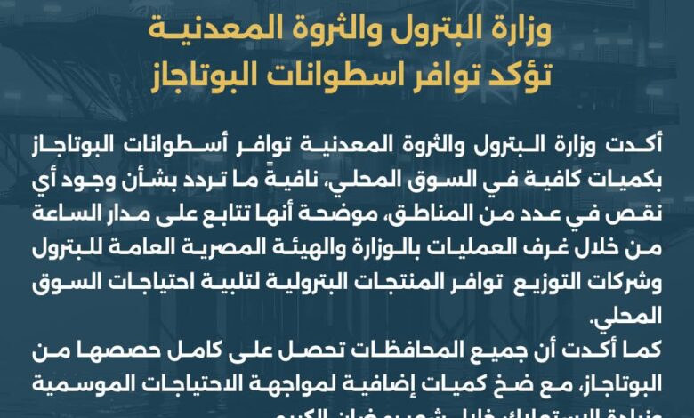كما أكدت أن جميع المحافظات تحصل على كامل حصصها من البوتاجاز، مع ضخ كميات إضافية لمواجهة الاحتياجات الموسمية وزيادة الاستهلاك خلال شهر رمضان الكريم.