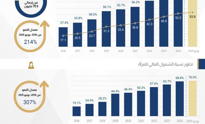 وبشكل عام، بلغ معدل نمو الشمول المالي نسبة 214% خلال الفترة من 2016 حتى يونيو 2025، مما يعكس زيادة استفادة المواطنين من الخدمات المالية.