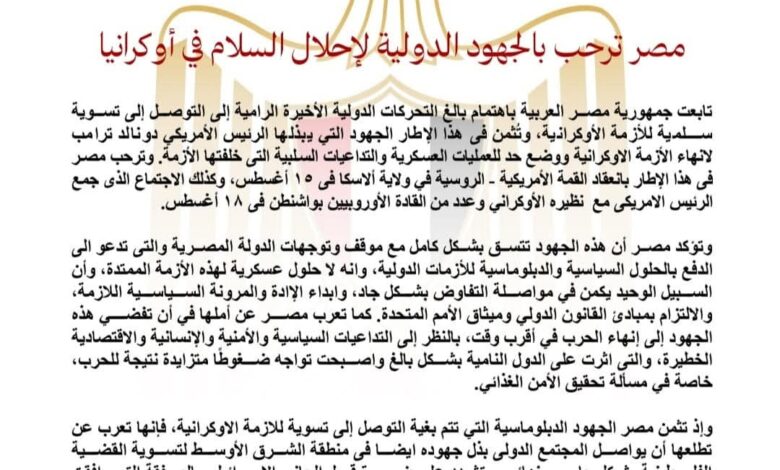 تابعت جمهورية مصر العربية باهتمام بالغ التحركات الدولية الأخيرة الرامية إلى التوصل إلى تسوية سلمية للأزمة الأوكرانية، وتُثمن فى هذا الإطار الجهود التي يبذلها الرئيس الأمريكي دونالد ترامب لانهاء الأزمة الاوكرانية ووضع حد للعمليات العسكرية والتداعيات السلبية التى خلفتها الأزمة. وترحب مصر فى هذا الإطار بانعقاد القمة الأمريكية – الروسية في ولاية ألاسكا فى ١٥ أغسطس، وكذلك الاجتماع الذى جمع الرئيس الامريكى مع نظيره الأوكراني وعدد من القادة الأوروبيين بواشنطن فى ١٨ أغسطس.