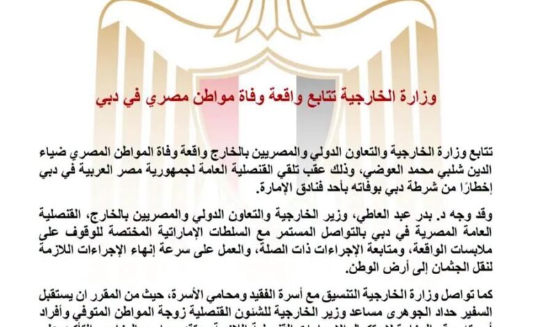 تتابع وزارة الخارجية والتعاون الدولى والمصريين بالخارج واقعة وفاة المواطن المصري ضياء الدين شلبي محمد العوضي، وذلك عقب تلقي القنصلية العامة لجمهورية مصر العربية في دبي إخطارًا من شرطة دبي بوفاته بأحد فنادق الإمارة.