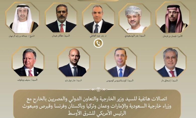 جرت اتصالات هاتفية بين د. بدر عبد العاطي وزير الخارجية والتعاون الدولي والمصريين بالخارج، وكل من الشيخ عبد الله بن زايد نائب رئيس الوزراء ووزير خارجية الإمارات، والأمير فيصل بن فرحان وزير خارجية المملكة العربية السعودية الشقيقة، والسيد بدر البوسعيدي وزير خارجية سلطنة عُمان الشقيقة، والسيد هاكان فيدان وزير خارجية الجمهورية التركية، والسيد إسحاق دار نائب رئيس الوزراء ووزير خارجية جمهورية باكستان الإسلامية، والسيد جان نويل بارو وزير خارجية الجمهورية الفرنسية، والسيد كونستانتينوس كومبوس وزير خارجية قبرص، بالإضافة إلى السيد ستيف ويتكوف المبعوث الأمريكي الخاص للشرق الأوسط، يوم الاثنين ٢٣ مارس الجاري.