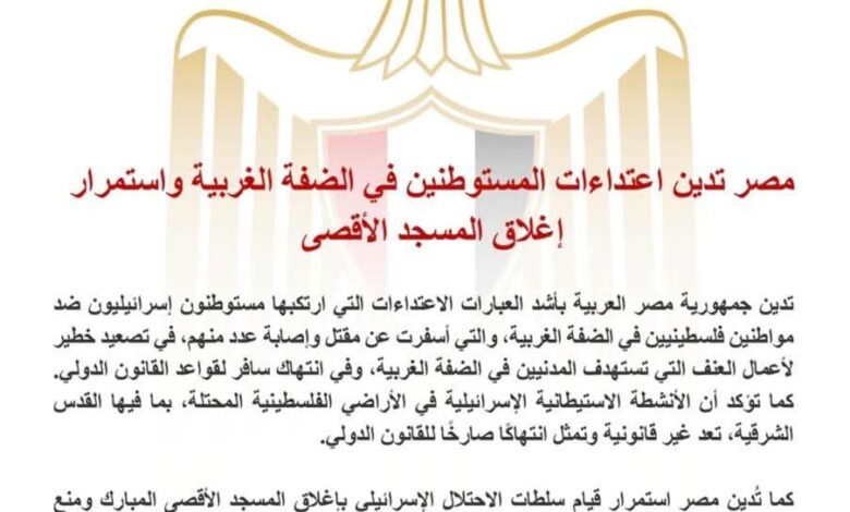 تدين جمهورية مصر العربية بأشد العبارات الاعتداءات التي ارتكبها مستوطنون إسرائيليون ضد مواطنين فلسطينيين في الضفة الغربية، والتي أسفرت عن مقتل وإصابة عدد منهم، في تصعيد خطير لأعمال العنف التي تستهدف المدنيين في الضفة الغربية، وفي انتهاك سافر لقواعد القانون الدولي. كما تؤكد أن الأنشطة الاستيطانية الإسرائيلية في الأراضي الفلسطينية المحتلة، بما فيها القدس الشرقية، تعد غير قانونية وتمثل انتهاكًا صارخًا للقانون الدولي.
