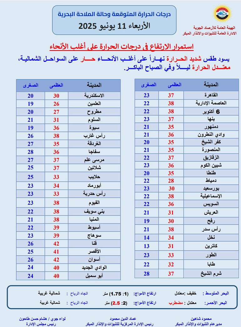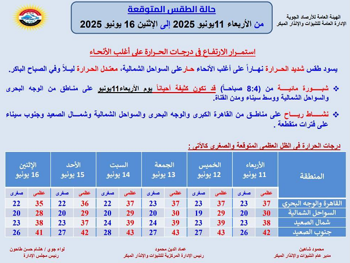 حالة الطقس اليوم الأربعاء 11 يونيو 2025: موجة حر شديدة وتوقعات بانكسارها قريبًا
