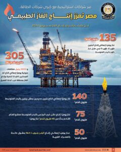 وبشأن أبرز اكتشافات وآبار إنتاج الغاز منذ يوليو 2024، أوضحت الإنفوجرافات أن إجمالي إنتاج بئري ظهر 6 وظهر 9 في حقل غاز ظهر بالبحر المتوسط يبلغ 135 مليون قدم3 غاز يوميًا.