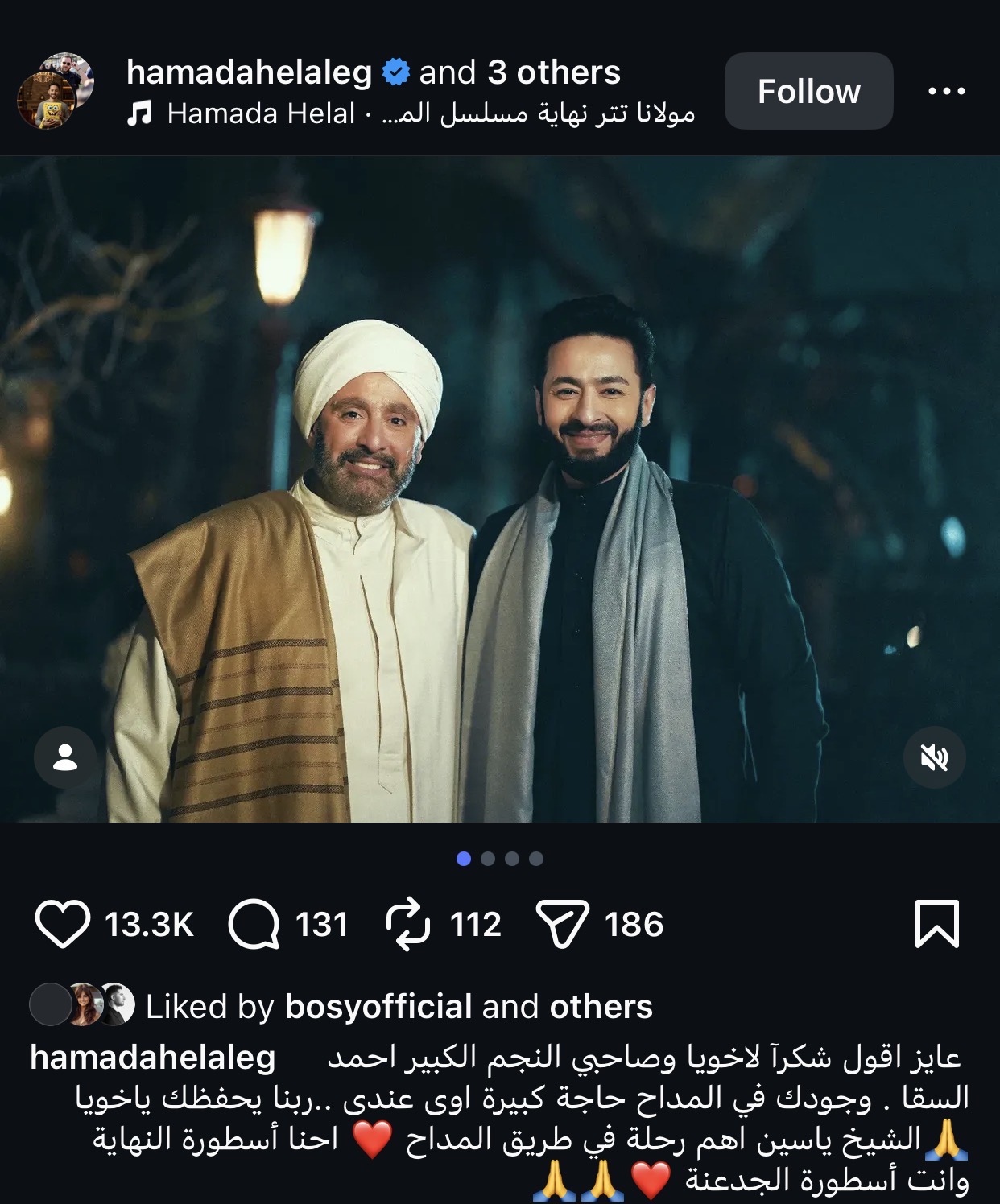 وجّه الفنان حمادة هلال رسالة شكر خاصة إلى النجم أحمد السقا، عقب ظهوره المفاجئ ضمن أحداث مسلسل المداح 6، معبرًا عن امتنانه الكبير لمشاركته في العمل.