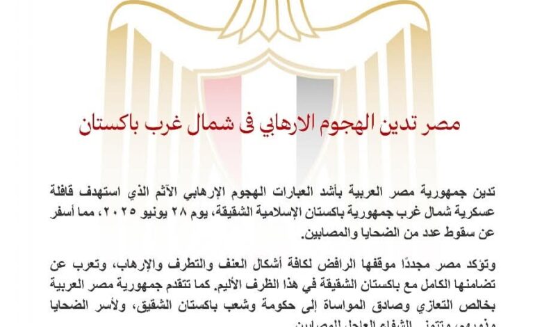 تدين جمهورية مصر العربية بأشد العبارات الهجوم الإرهابي الآثم الذي استهدف قافلة عسكرية شمال غرب جمهورية باكستان الإسلامية الشقيقة، يوم ٢٨ يونيو ٢٠٢٥، مما أسفر عن سقوط عدد من الضحايا والمصابين.