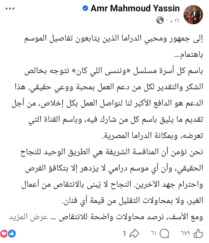 أصدر الكاتب والسيناريست عمرو محمود ياسين بيانًا رسميًا موجّهًا إلى جمهور ومحبي الدراما، عبّر فيه عن امتنانه لكل من دعم مسلسل «وننسى اللي كان» منذ بدء عرضه، مؤكدًا أن هذا الدعم يمثل الدافع الأكبر لفريق العمل للاستمرار في تقديم محتوى يليق بالدراما المصرية وبأسماء المشاركين فيه.