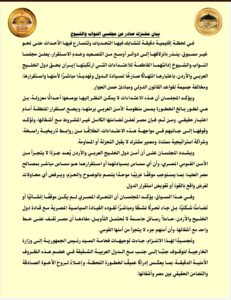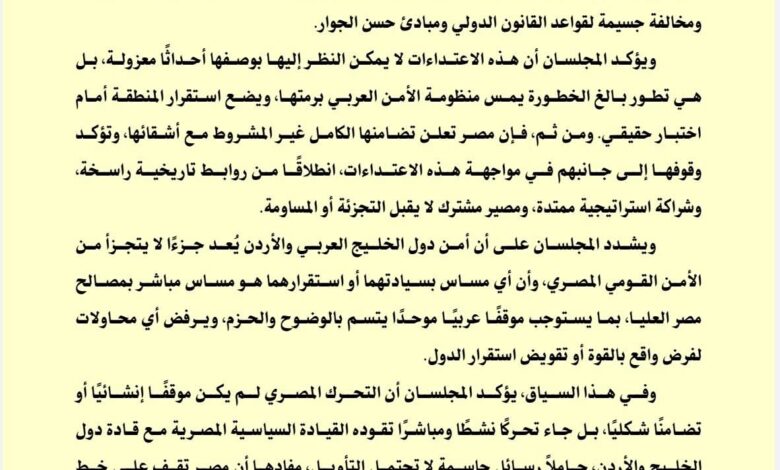 -استمرار التصعيد يمثل تهديداً مباشراً لأمن الشعوب العربية، لذا يدعو المجلسان إلى ضرورة بلورة ترتيبات إقليمية شاملة تعزز مفهوم الأمن الجماعي العربي وتترجمه إلى آليات تنفيذية قادرة على حماية سيادة الدول وصون مقدراتها.