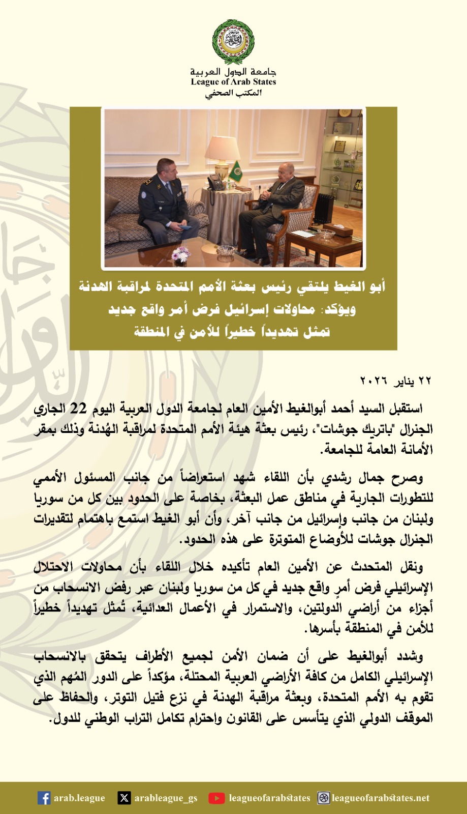 استقبل أحمد أبو الغيط، الأمين العام لجامعة الدول العربية، اليوم ٢٢ يناير الجاري، الجنرال “باتريك جوشات”، رئيس بعثة هيئة الأمم المتحدة لمراقبة الهدنة، وذلك بمقر الأمانة العامة للجامعة.