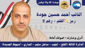 ويتقدم النائب احمد حسين جودة مرشح عضوية مجلس النواب عن الدائرة الثالثة الفتح البداري وساحل سليم ابنوب بخالص الشكر والعرفان إلى جميع أهالي وعائلات الدائرة الكرام، على مشاركتهم المشرفة والمكثفة خلال اليومين الانتخابيين في انتخابات مجلس النواب 2025.