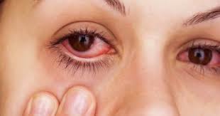 احمرار شديد، إفرازات، ألم في العين، أو تغير في الرؤية.
