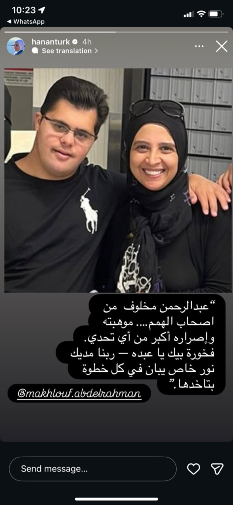 ونشرت ترك صورة لعبدالرحمن عبر خاصية ستوري إنستجرام، وعلقت: “عبد الرحمن من ذوي الهمم، موهبته وإصراره أكبر من أي تحدي. فخورة بيك يا عبده، ربنا مديك نور خاص بيبان في كل خطوة بتاخدها”، مشيدة بموهبته وروحه الإيجابية في مواجهة التحديات.