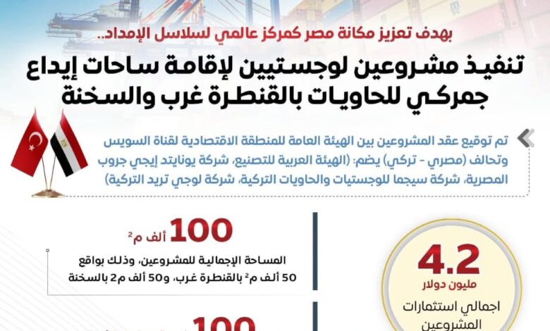 توقيع عقد مشروعين لإقامة ساحات إيداع جمركي للحاويات بالقنطرة غرب والسخنة، باستثمارات بلغت نحو 4.2 مليون دولار