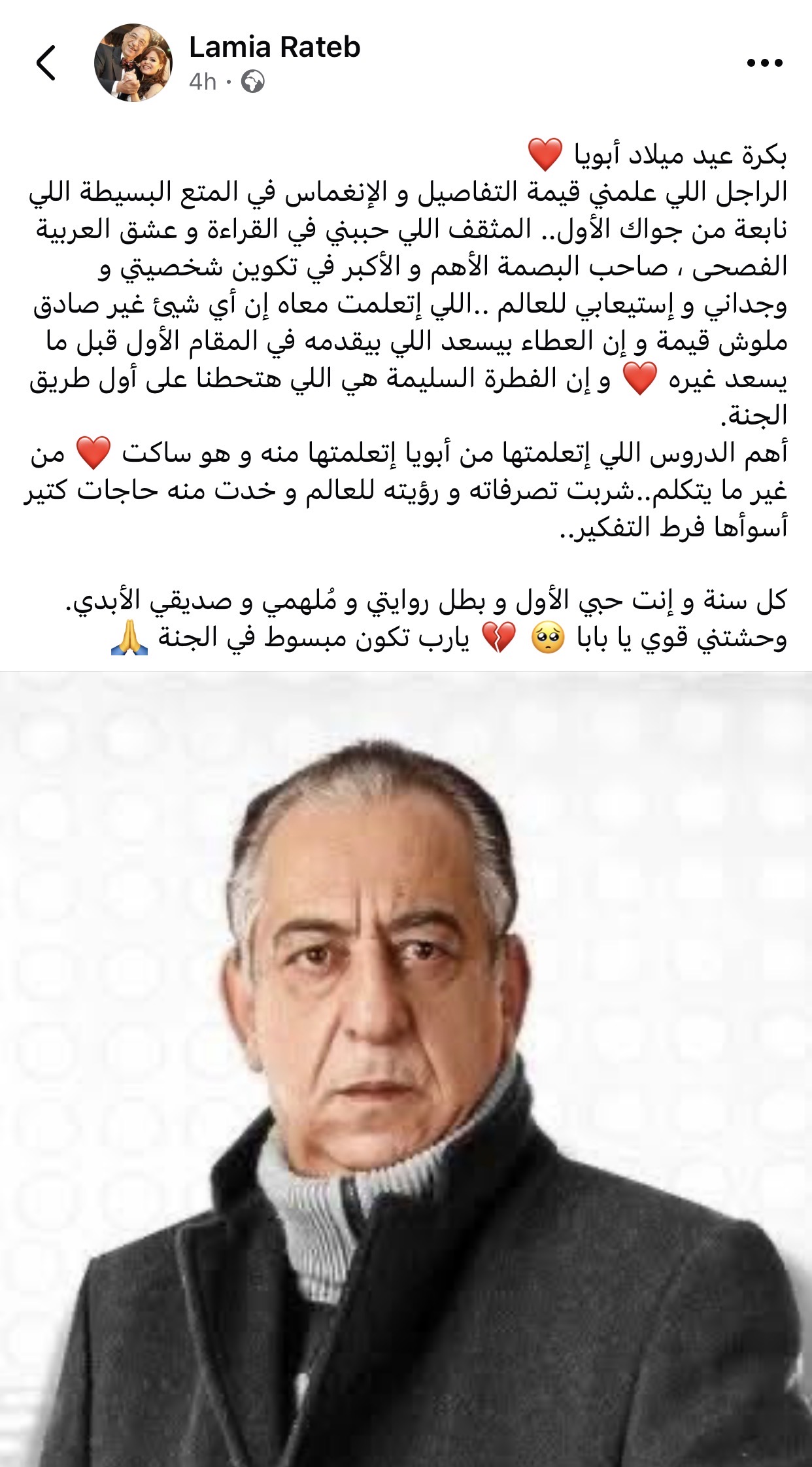 وتابعت: “المثقف اللي حببني في القراءة و عشق العربية الفصحى ، صاحب البصمة الأهم و الأكبر في تكوين شخصيتي و وجداني و إستيعابي للعالم ..اللي إتعلمت معاه إن أي شيئ غير صادق ملوش قيمة و إن العطاء