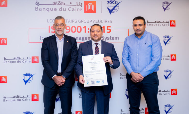 بنك القاهرة يحصل على شهادة الأيزو 9001:2015 لمجموعة الشئون القانونية في نظام إدارة الجودة.