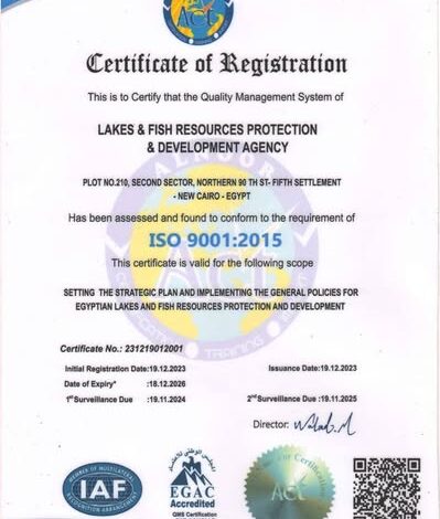 للمرة الثانية على التوالي.. تجديد شهادة الأيزو ISO 9001:2015 لجهاز حماية وتنمية البحيرات والثروة السمكية