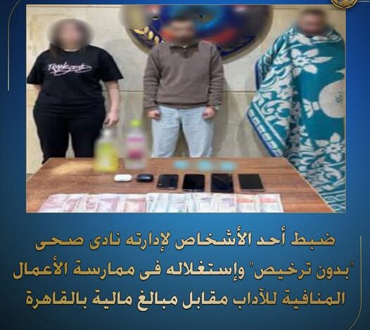 ضبط (أحد الأشخاص) بإدارة نادى صحى “بدون ترخيص” وإستغلاله فى ممارسة الأعمال المنافية للآداب العامة مقابل مبالغ مالية