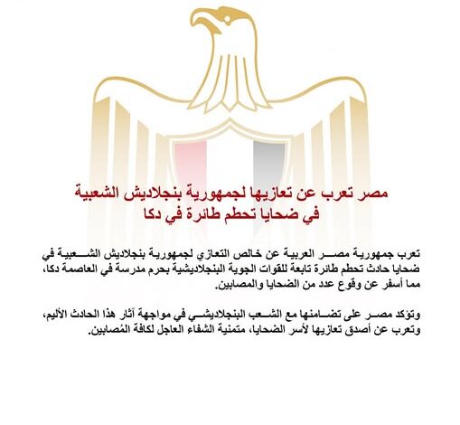 تعرب جمهورية مصر العربية عن خالص التعازي لجمهورية بنجلاديش الشعبية في ضحايا حادث تحطم طائرة تابعة للقوات الجوية البنجلاديشية بحرم مدرسة في العاصمة دكا، مما أسفر عن وقوع عدد من الضحايا والمصابين.