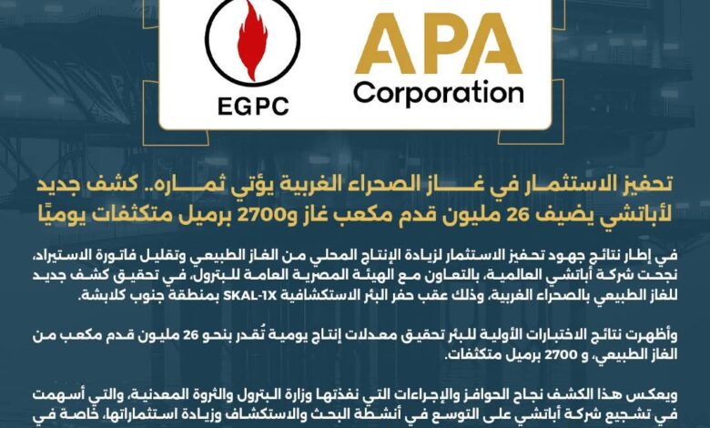 تحفيز الاستثمار في غاز الصحراء الغربية يؤتي ثماره.. كشف جديد لأباتشي يضيف 26 مليون قدم مكعب غاز و2700 برميل متكثفات يوميًا
