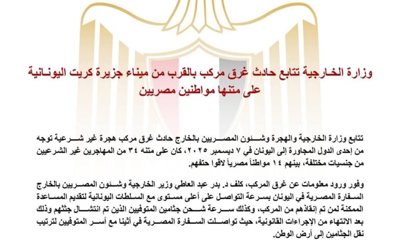 وزارة الخارجية تتابع حادث غرق مركب بالقرب من ميناء جزيرة كريت اليونانية علي متنها مواطنين مصريين