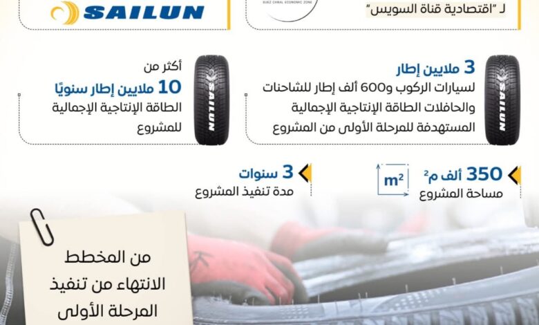 في إطار تنفيذ استراتيجية الدولة لتوطين صناعة السيارات، والسلاسل التصنيعية المتعلقة بها، تم توقيع عقد إنشاء مصنع “مجموعة سايلون “Sailun Group الصينية لتصنيع الإطارات الأوتوماتيكية بأنواعها، بإجمالي استثمارات بلغت نحو مليار دولار، وتعد هذه المجموعة من كبرى الكيانات الصناعية الصينية في قطاع صناعة إطارات السيارات والمركبات بمختلف أنواعها، ويستهدف المشروع تغطية احتياجات السوق المحلية، وكذلك التصدير للخارج.