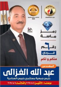 مهندس عبد الله الغزالي مرشح مجلس الشيوخ عن الانتخابات البرلمانية ٢٠٢٥فردي ورئيس جمعية مستثمري بلبيس