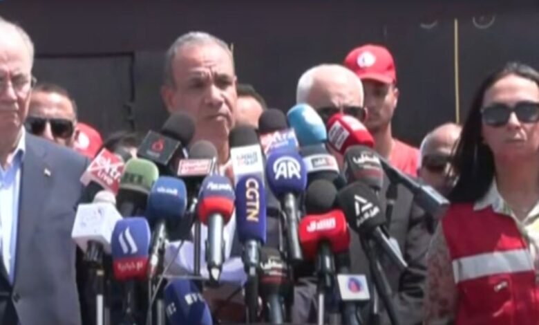 جاء ذلك خلال مؤتمر صحفي عقد اليوم الإثنين من أمام معبر رفح البري على الجانب المصري، بمشاركة وفد رفيع المستوى، وبحضور الدكتور محمد مصطفى، رئيس الوزراء الفلسطيني، وعدد من الوزراء الفلسطينيين.