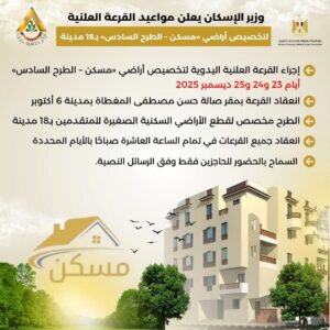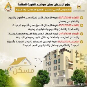 كما سيتم إجراء القرعة العلنية يوم 25/12/2025 للمتقدمين لحجز أراضي إسكان متوسط بمدن (أسوان الجديدة – أسيوط الجديدة – العاشر من رمضان – المنيا الجديدة – برج العرب الجديدة).
