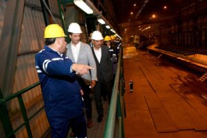 ثم تفقد الوزير مصنع حديد عز بالعين السخنة التابع لمجموعة حديد عز والمقام على مساحة 3 مليون متر مربع برأس مال يبلغ 6.5 مليار جنيه وتبلغ الطاقة الإنتاجية للمصنع 2.2 مليون طن سنويًا، وتوفر المجموعة أكثر من 10 آلاف فرصة عمل مباشرة وأكثر من 10 أضعاف هذا العدد فرص عمل غير مباشرة، وقد بلغت صادرات المجموعة مليار دولار عام 2025 من منتجات (ألواح الصلب المسطح ـ حديد تسليح)، وقد كان في استقبال الوزير السيدة/ عفاف أحمد عز رئيس قطاع تطوير الاعمال بالمجموعة والأستاذ/ علاء أبو الخير نائب رئيس مجموعة عز الصناعية، وخلال الزيارة تفقد الوزير مصنع الاختزال، ومنطقة الأفران والماكينات، ومراحل درفلة الصلب المسطح وصولاً للمنتج النهائي.