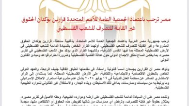 مصر ترحب باعتماد الجمعية العامة للأمم المتحدة قرارين يؤكدان الحقوق غير القابلة للتصرف للشعب الفلسطيني