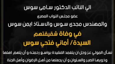 الرأي العام المصري تتقدم بخالص العزاء الي النائب سامي سوس في وفاة شقيقته