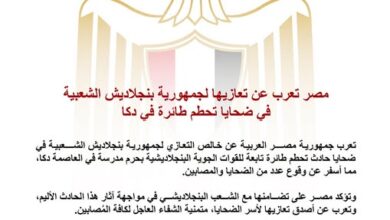 مصر تعرب عن تعازيها لجمهورية بنجلاديش الشعبية في ضحايا تحطم طائرة في دكا